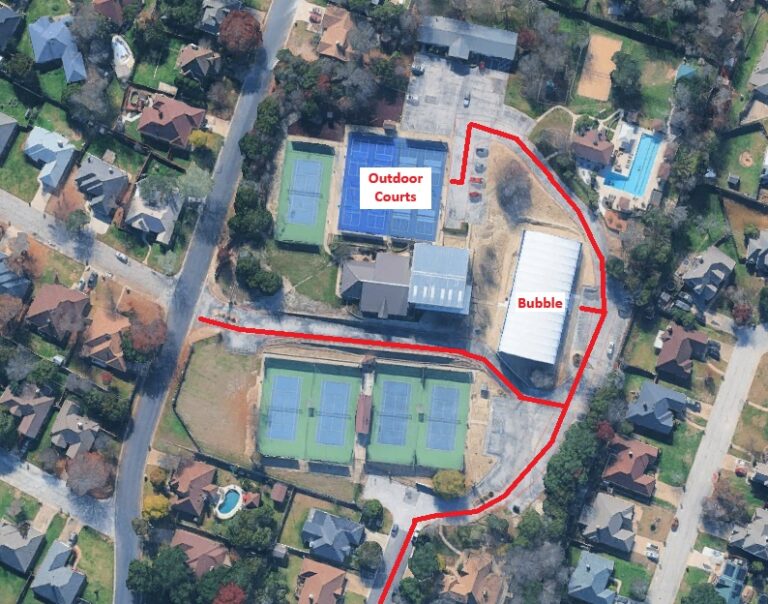 You’ll either be in our Bubble (Monday Intro), or on our Outdoor Courts, which are past the Bubble and at the top of the club:
